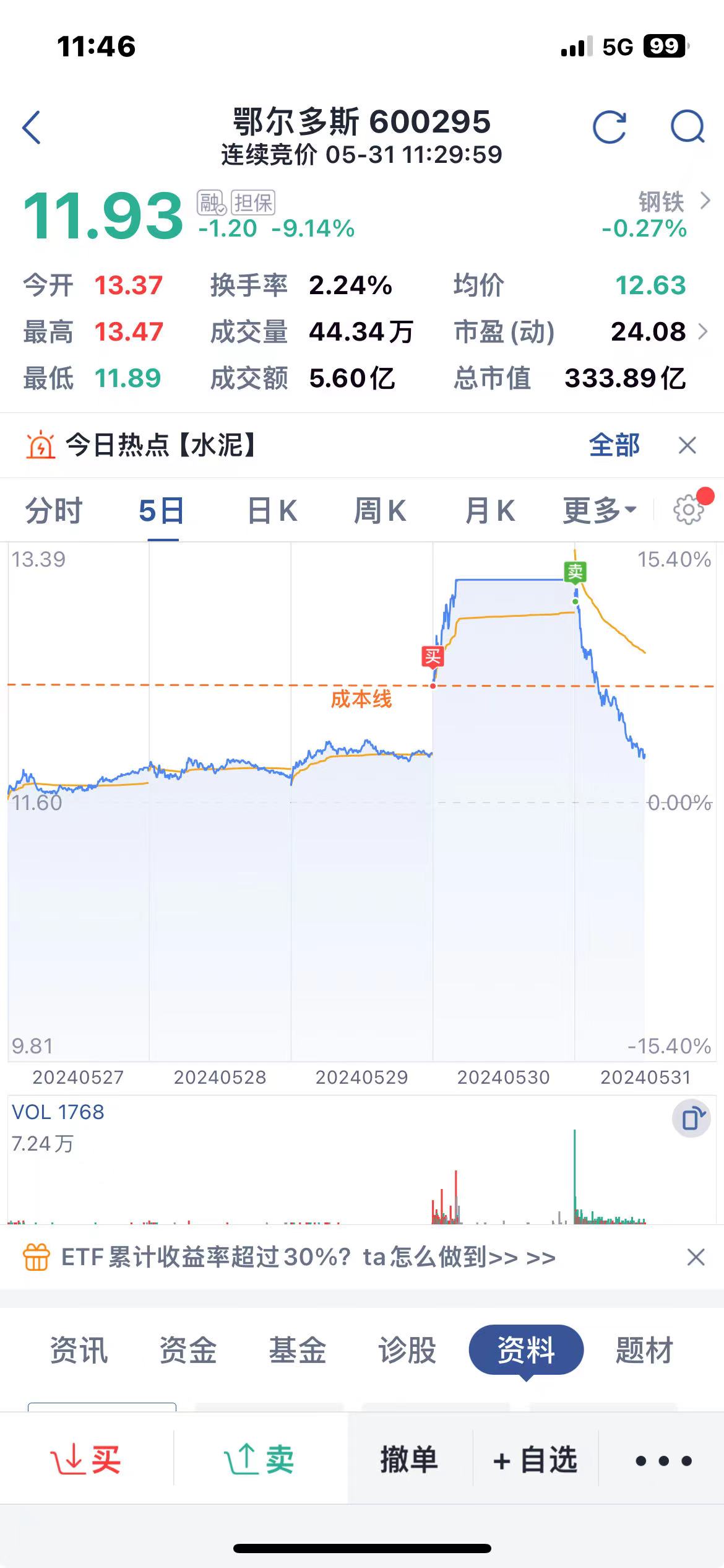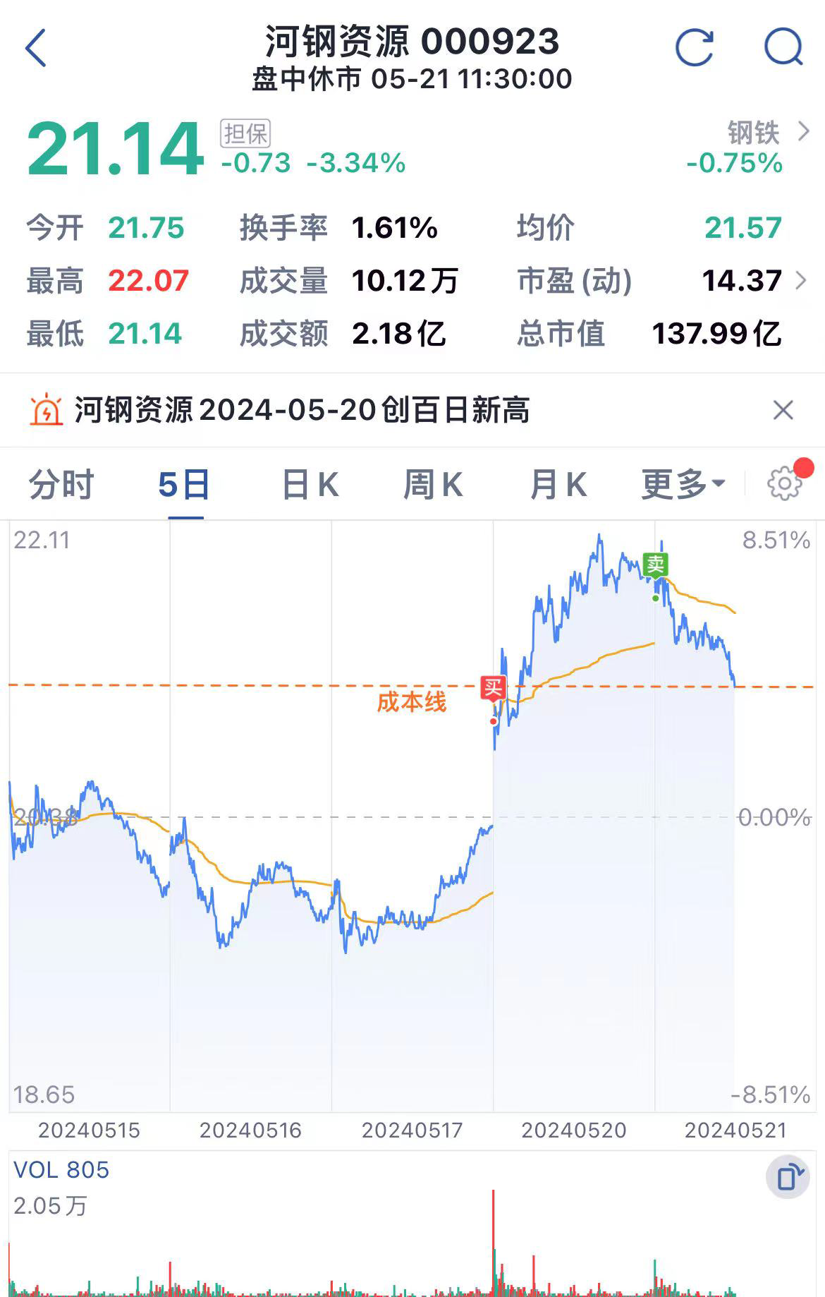 河钢资源次日下跌 -3.34%,在暴跌前卖出,成功锁利。