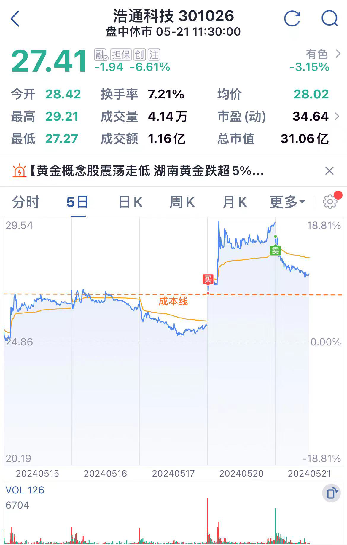 浩通科技次日下跌 -6.61%,在暴跌前卖出,成功锁利。